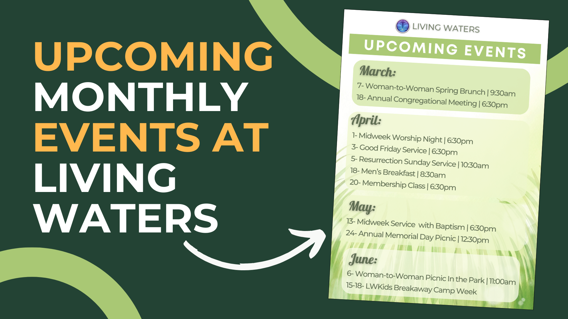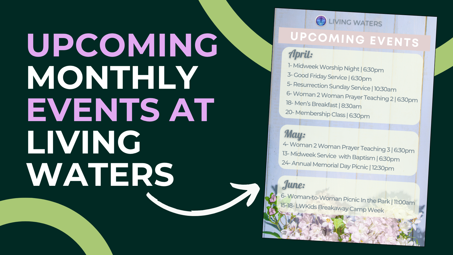 Keep up with our event calendar so you know all that we have going on at Living Waters Church.